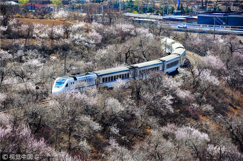 2019年3月22日,北京居庸关附近的山花盛开,S2线列车穿行在花海之中,构成一幅美丽的画面。