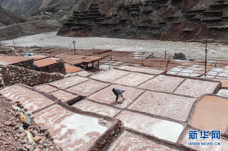 西藏芒康县纳西民族乡加达村村民在盐田晒盐(6月4日摄)。新华社记者晋美多吉摄