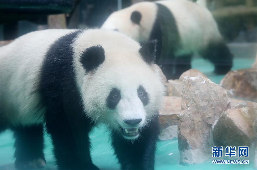 6月18日,大熊猫“和风”(前)透过玻璃幕墙向外张望。 当日,来自四川的大熊猫兄弟“和风”与“星光”飞抵上海,正式开始了在上海动物园为期三年的生活。为迎接这对“风光兄弟”,上海动物园将原有的大熊猫馆扩建并装修一新,空调、水池、游乐场以及竹叶储存间等配置齐全。 新华社记者 方喆 摄