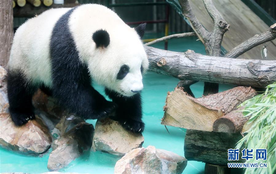 6月18日,大熊猫“星光”走在馆内水池边的石头上。 当日,来自四川的大熊猫兄弟“和风”与“星光”飞抵上海,正式开始了在上海动物园为期三年的生活。为迎接这对“风光兄弟”,上海动物园将原有的大熊猫馆扩建并装修一新,空调、水池、游乐场以及竹叶储存间等配置齐全。 新华社记者 方喆 摄