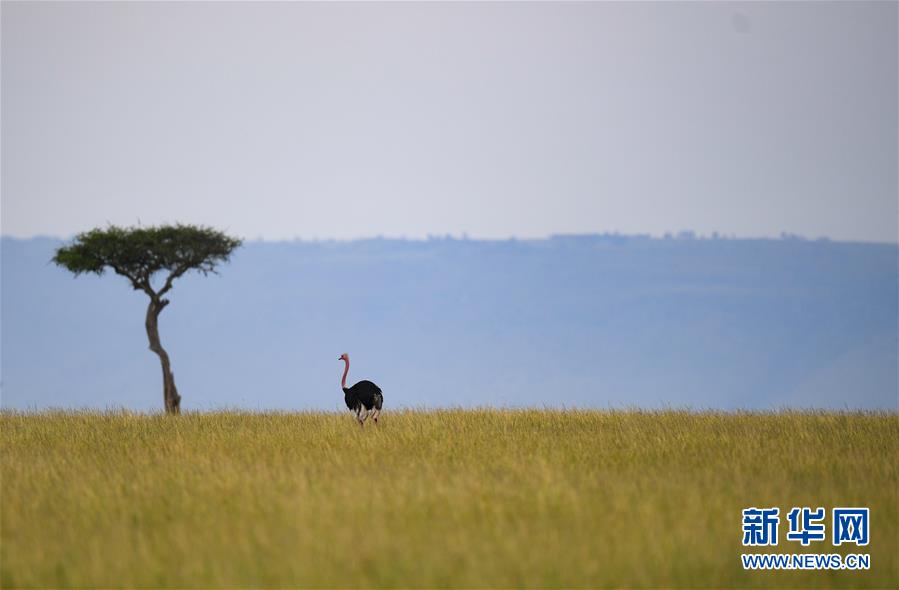 6月18日,在肯尼亚马赛马拉国家保护区,一只鸵鸟在觅食。 新华社记者 李琰 摄