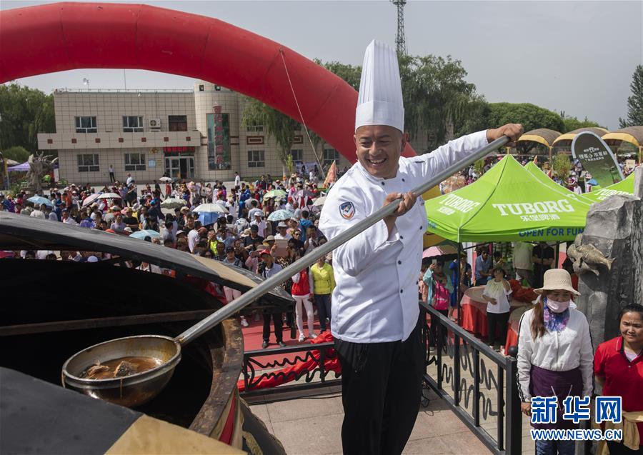 6月22日,在博斯腾湖开湖仪式上,一名厨师舀起刚刚烹制好的鱼。新华社记者 赵戈 摄