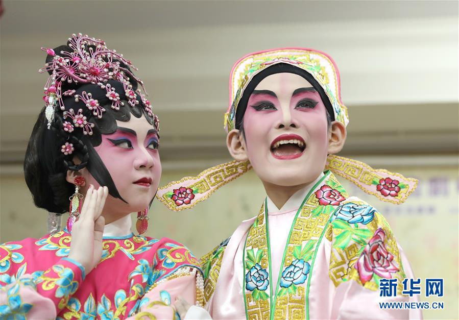 一群孩子和79岁的粤剧名伶杨剑华在一起(6月8日摄)。 声辉粤剧推广协会成立于2003年,是香港重要粤剧艺术团体之一,致力于向青少年推广粤剧。协会目前有两个初班,3个中班,一个青少年班。粤剧又称“广东大戏”,表演技艺包括“唱做念打”,即唱功、身段、台词、武打,主要流行于广东、广西和香港、澳门等地区。2009年,粤剧被列入联合国教科文组织人类非物质文化遗产代表作名录,今年正逢十周年。 新华社记者 吴晓初 摄