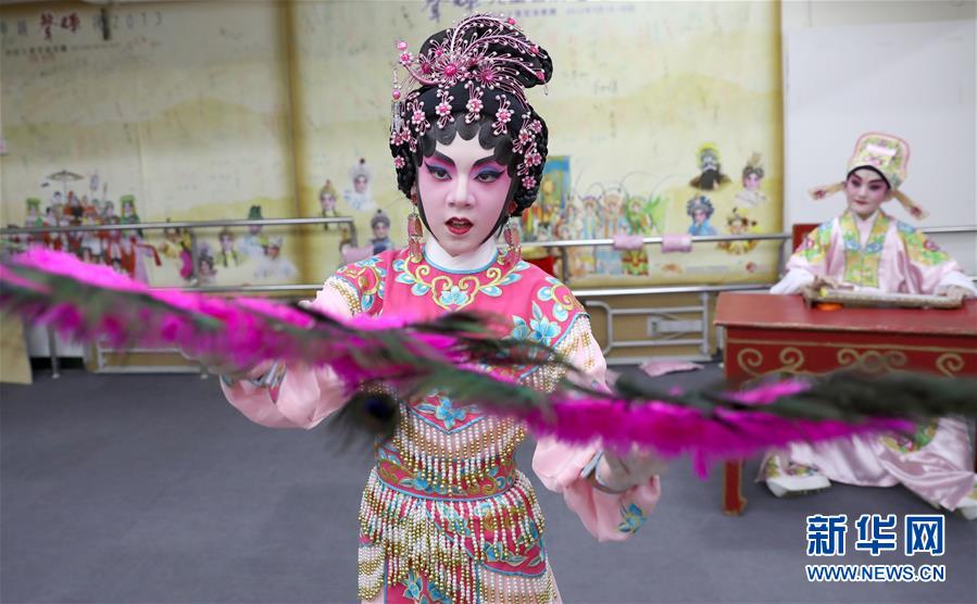 粤剧小演员陆瑞徽在准备折子戏《艳曲醉周郎》的表演(6月8日摄)。 声辉粤剧推广协会成立于2003年,是香港重要粤剧艺术团体之一,致力于向青少年推广粤剧。协会目前有两个初班,3个中班,一个青少年班。粤剧又称“广东大戏”,表演技艺包括“唱做念打”,即唱功、身段、台词、武打,主要流行于广东、广西和香港、澳门等地区。2009年,粤剧被列入联合国教科文组织人类非物质文化遗产代表作名录,今年正逢十周年。 新华社记者 吴晓初 摄