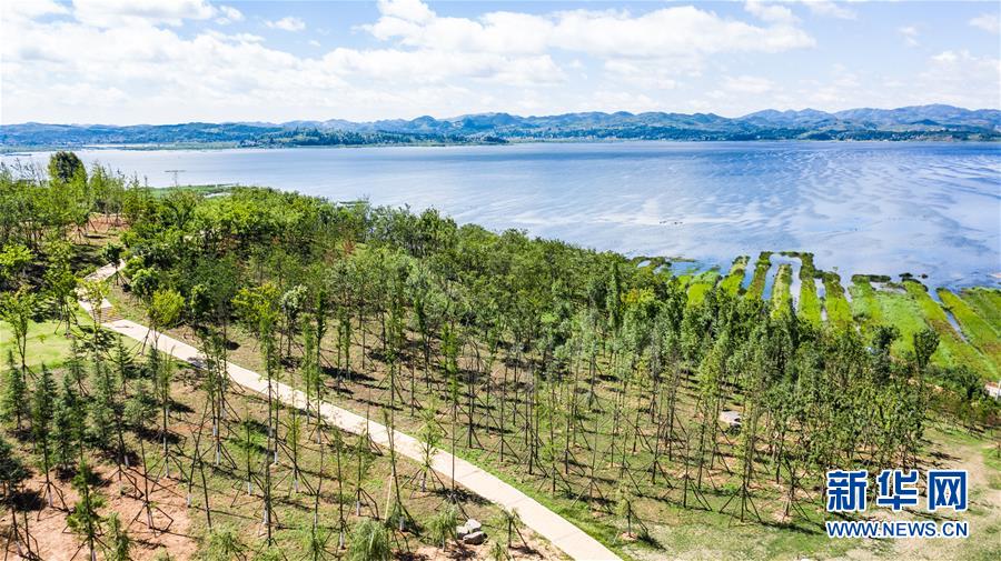 6月20日无人机拍摄的草海国家级自然保护区造林涵湖工程一隅。 新华社记者 陶亮 摄