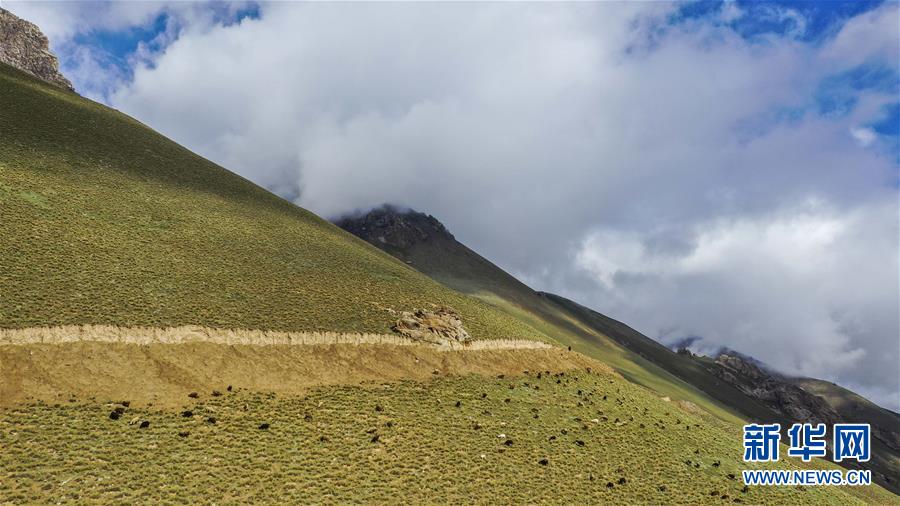 牛羊在拉依布拉克牧场觅食(6月22日无人机拍摄)。新华社记者 胡虎虎 摄