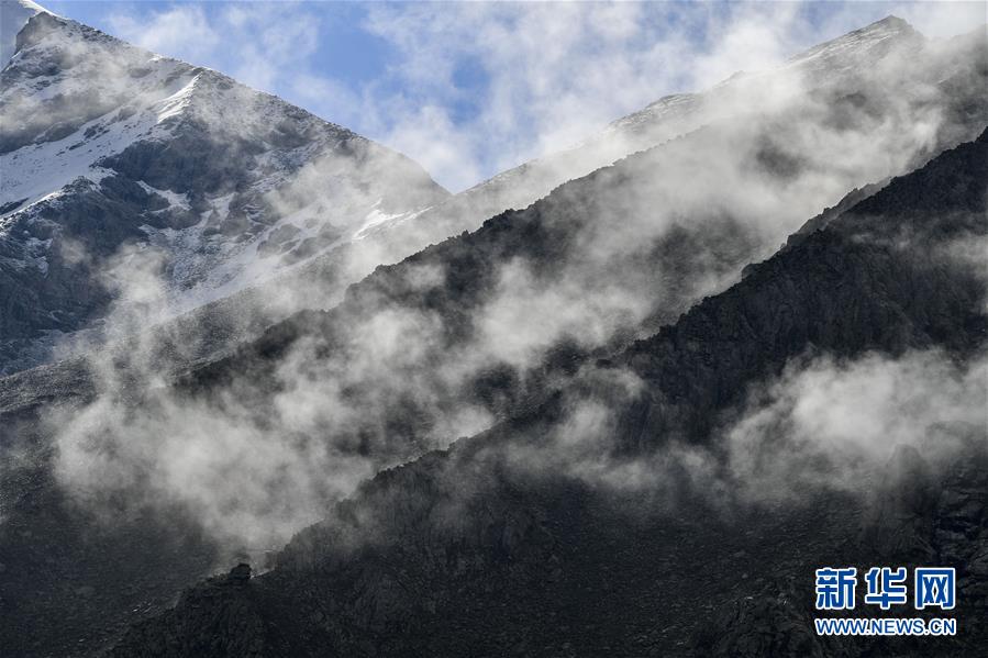 拉依布拉克牧场山间云雾缭绕(6月22日摄)。新华社记者 胡虎虎 摄