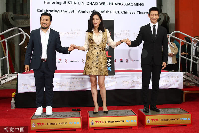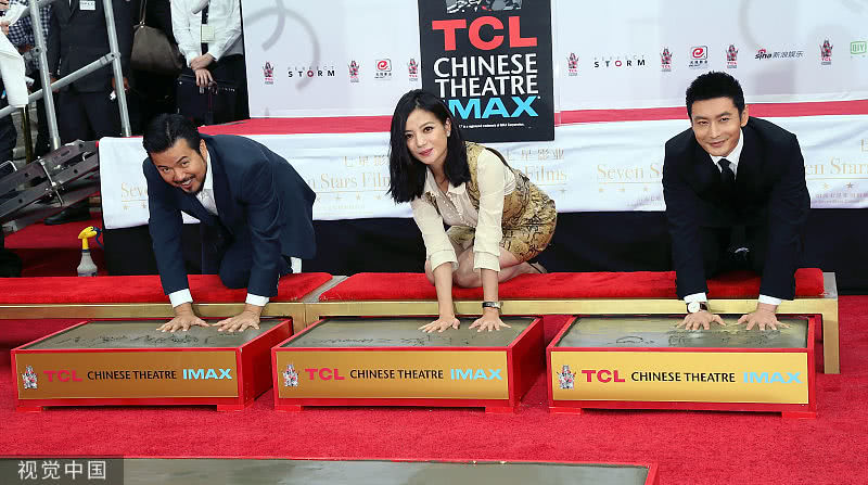 赵薇和黄晓明在好莱坞TCL中国大剧院门前按下象征世界电影人无上荣誉的手印,在该地留印的华人明星只有三个,分别是成龙、吴宇森和冯小刚。