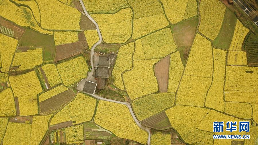 这是黟县卢村的油菜花田(3月28日无人机拍摄)。近日,安徽省黄山市黟县的油菜花迎来盛花期。金黄的油菜花与屋舍、道路等形成一幅幅美丽的乡村画卷,引人入胜。 新华社记者张端摄