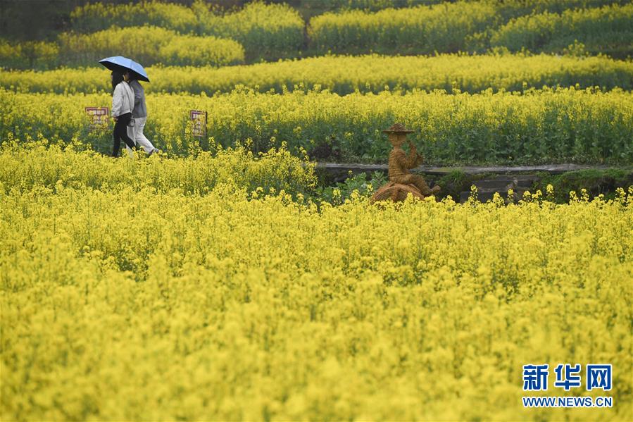 3月6日,游人在四川广汉市西高镇的油菜花公园里游玩。 新华社记者刘坤摄