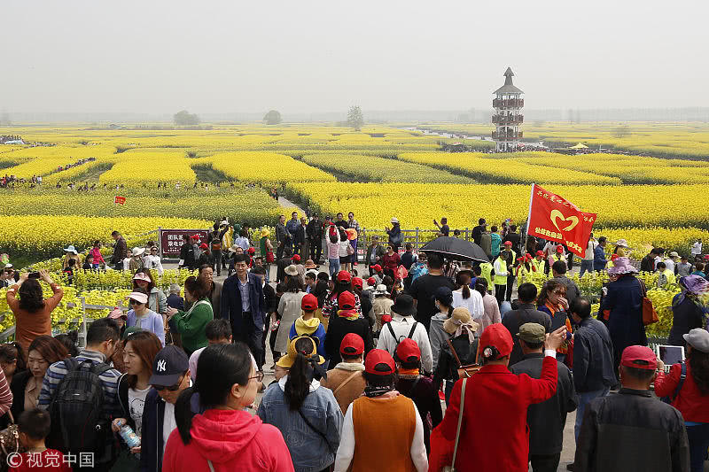 2019年4月7日,江苏省兴化市千垛菜花景区迎来旅游高峰期,数万游客前来欣赏盛开的油菜花,乐享假日好时光。
