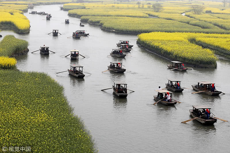 2019年4月7日,江苏省兴化市千垛菜花景区迎来旅游高峰期,数万游客前来欣赏盛开的油菜花,乐享假日好时光。