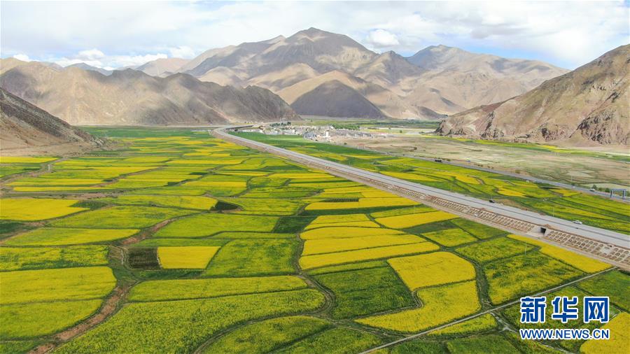7月2日在拉萨市堆龙德庆区德庆乡拍摄的油菜花田(无人机拍摄)。 近日,西藏各地的油菜花盛开,呈现出生机勃勃的夏日美景。 新华社记者 晋美多吉 摄