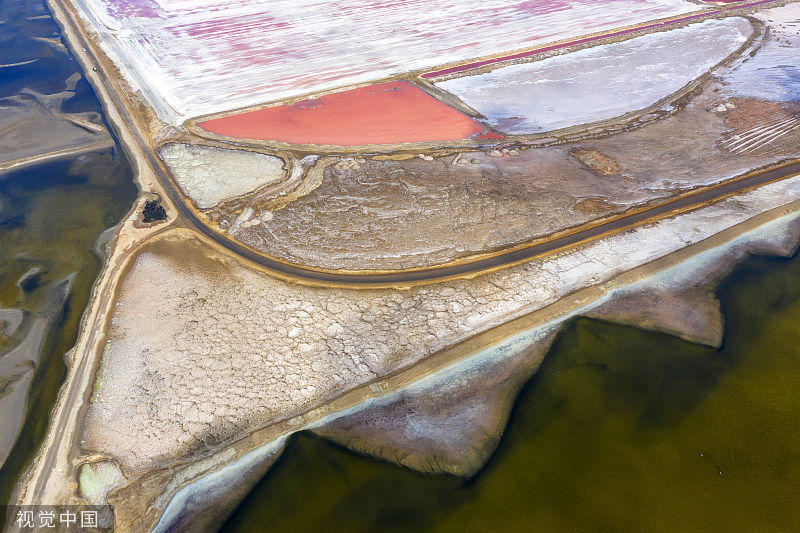 当地时间2019年6月11日,航拍纳米比亚沃尔维斯湾五彩盐田。盐田总面积达3500公顷(35平方千米),南非近90%的盐都由该地供应,盐田中生长的海藻和盐浓度不同造成盐田呈现出多种色彩,照片由自由摄影师Franco Cappellari使用无人机拍摄。