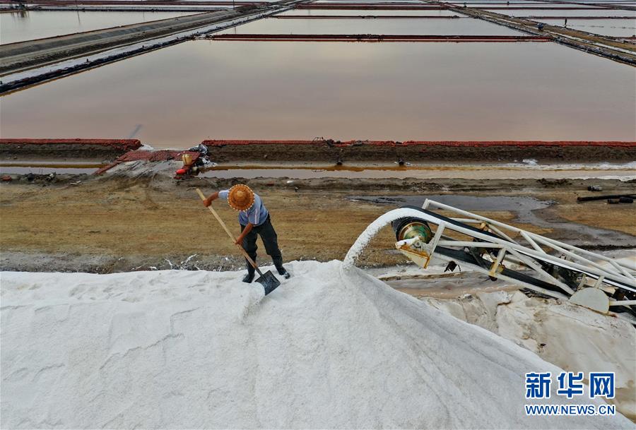 7月3日,唐山海港经济开发区大清河盐场的工人在盐堆上工作。新华社记者 杨世尧 摄