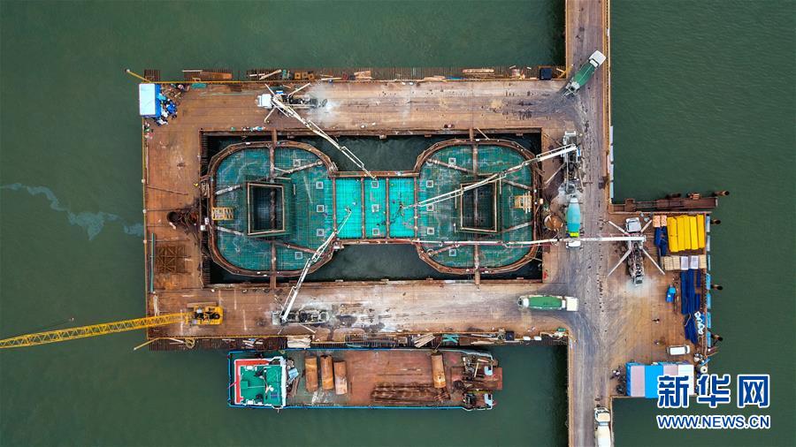 这是7月6日无人机拍摄的湛江调顺跨海大桥东岸主塔墩承台建设现场。 新华社记者 刘大伟 摄