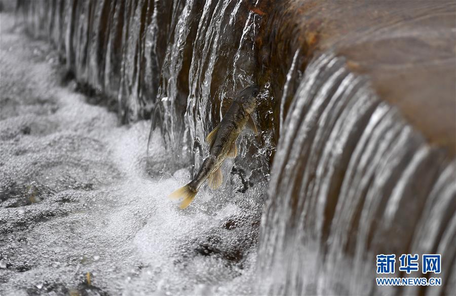 7月6日,青海省刚察县沙柳河里的湟鱼跃起向上洄游。 新华社记者 吴刚摄
