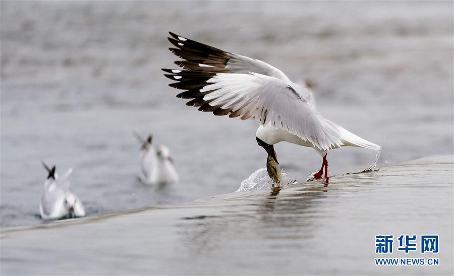 7月6日,在青海省刚察县沙柳河里,一只棕头鸥捕捉到一只跃起的湟鱼。 新华社记者 吴刚摄