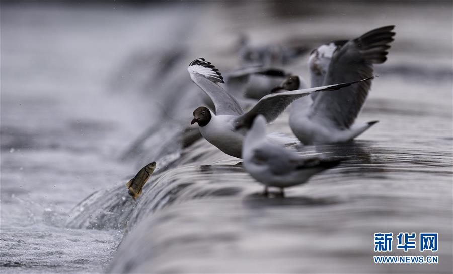 7月6日,在青海省刚察县沙柳河里,几只棕头鸥在等待捕捉跃起的湟鱼。 新华社记者 费茂华摄