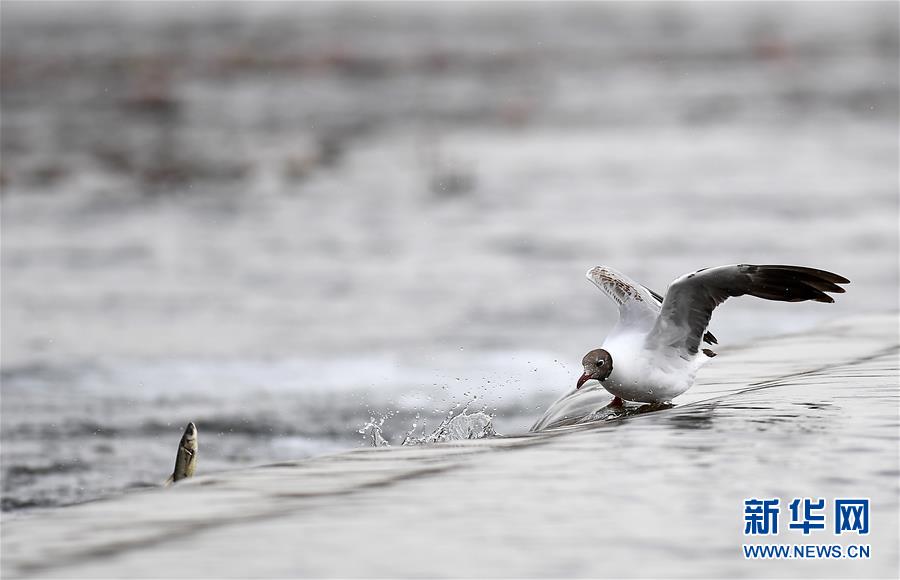 7月6日,在青海省刚察县沙柳河里,一只棕头鸥在觅食。 新华社记者 张宏祥摄