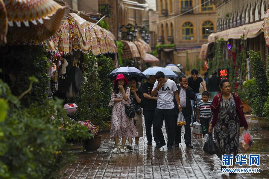 7月7日,游客在雨中的喀什古城景区里参观。 新华社记者 赵戈 摄