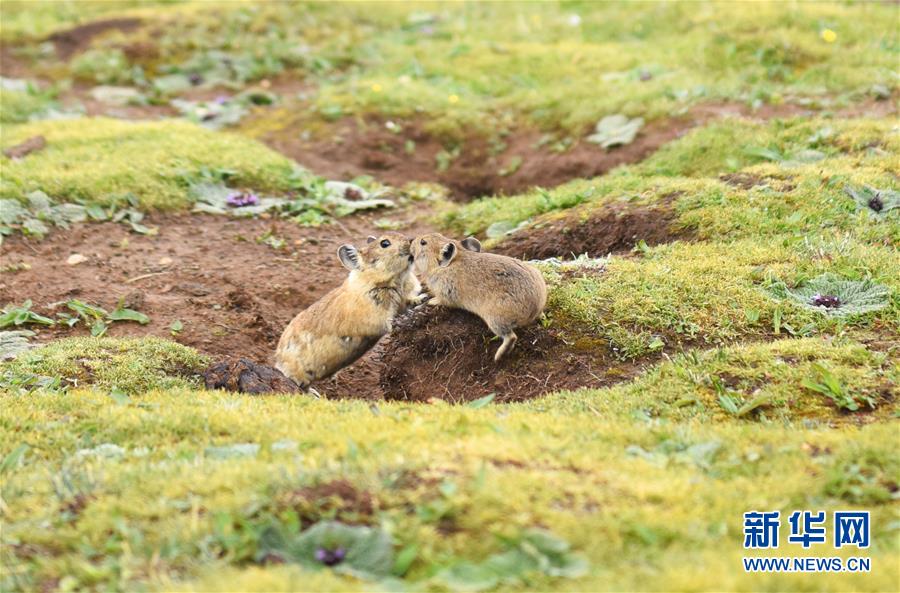 7月6日,两只高原鼠兔在西藏思金拉错湖边嬉戏。 新华社记者 周锦帅 摄