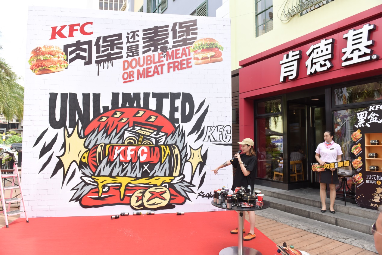 “肯德基是我非常喜欢的品牌,新潮、时尚。这一次与KFC的涂鸦合作,我在汉堡涂鸦的画面中融入了像滑板、打碟机这样的潮流元素,来演绎KFC厚菇堡这一款极具创新性的汉堡。用喷漆罐表现一整块芝士厚菇,一口咬下能喷出浓郁的芝士;火焰燃烧的造型代表汉堡中肆意的酱汁,增加视觉冲击感,呈现出一个没有肉,但很real的霸气素汉堡。”谈及创作理念,ROCKLEE说道,“这种结合我觉得很有意义,一方面展现了涂鸦这种街头文化多元的一面,另一方面也传递出KFC在汉堡界young OG的全新形象。”从创作到完工,整个过程都引来路人围观、拍照。从朋友圈看到消息的潮人又不断向此聚集、花式打卡。