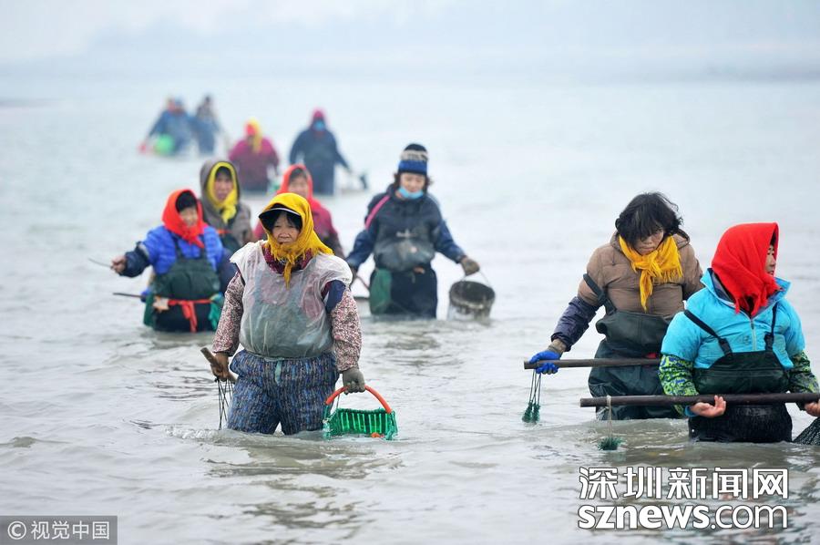 2018年12月22日,山东青岛西海岸新区唐岛湾南岸,市民蹚过海水带回湾底挖到的海蛎子。