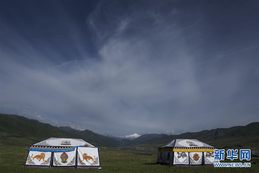 在阿尼玛卿雪山附近一个农家乐的院子里遥望阿尼玛卿雪山(7月10日摄)。 新华社记者 费茂华 摄