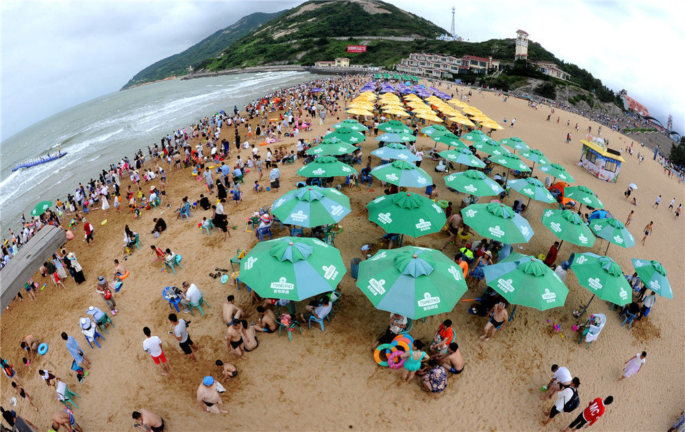 2018年7月7日,江苏省连云港市连岛大沙湾海滨浴场游客如潮。王春/视觉中国