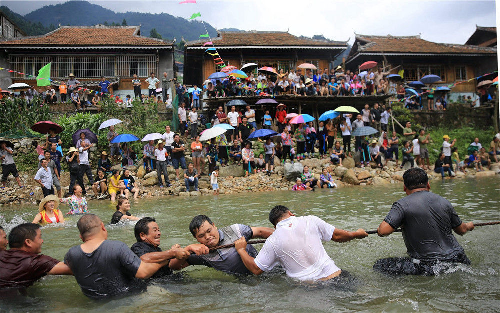2017年7月7日,在广西柳州市融水苗族自治县安太乡培秀村,村民在进行水上拨河。龙涛/视觉中国