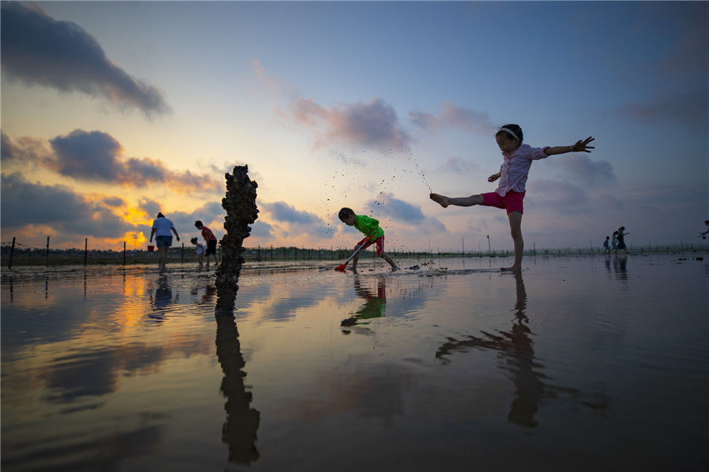 2018年7月6日傍晚,江苏连云港,一名小游客在海州湾旅游度假区海边戏水。司伟/视觉中国