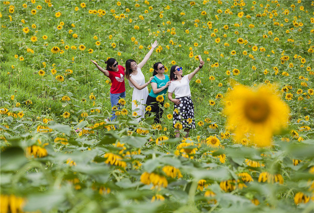 2018年7月7日,游客在重庆市黔江区沙坝乡木良村的向日葵花海中赏花拍照。张益明/视觉中国