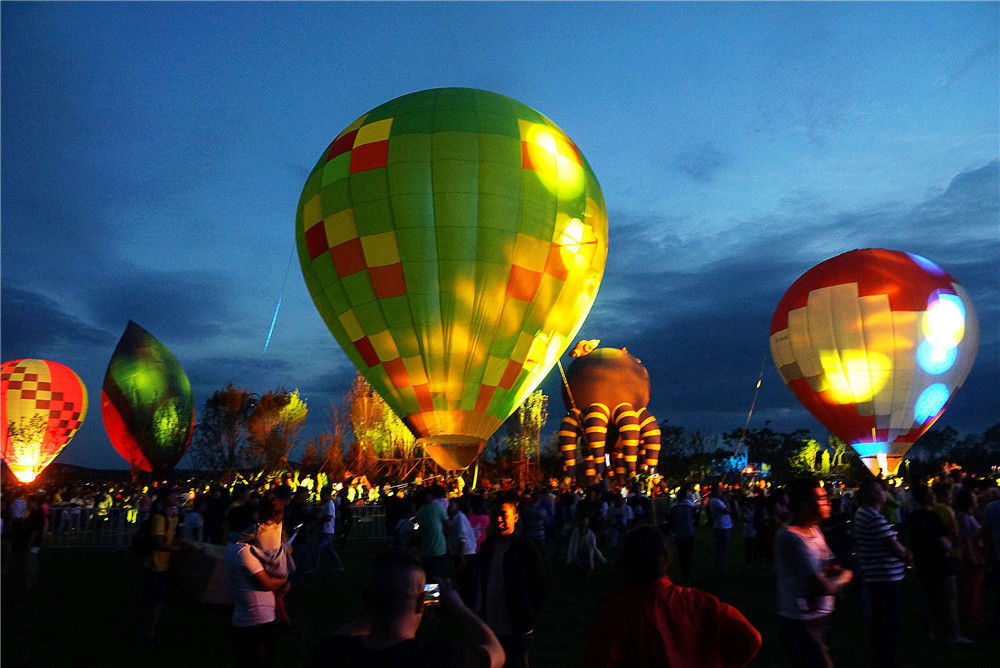 2018年7月7日,大连热气球嘉年华在万科莫亚国际营地启幕,包括四个国际异型球在内的12只热气球闪耀亮相。南宫傲青/视觉中国