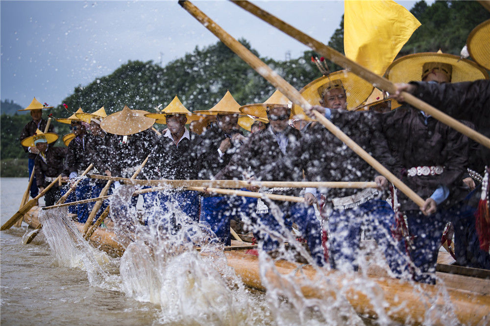 2018年7月7日,贵州省黔东南苗族侗族自治州台江县施洞镇清水江上竞渡的独木龙舟。欧阳光林/视觉中国