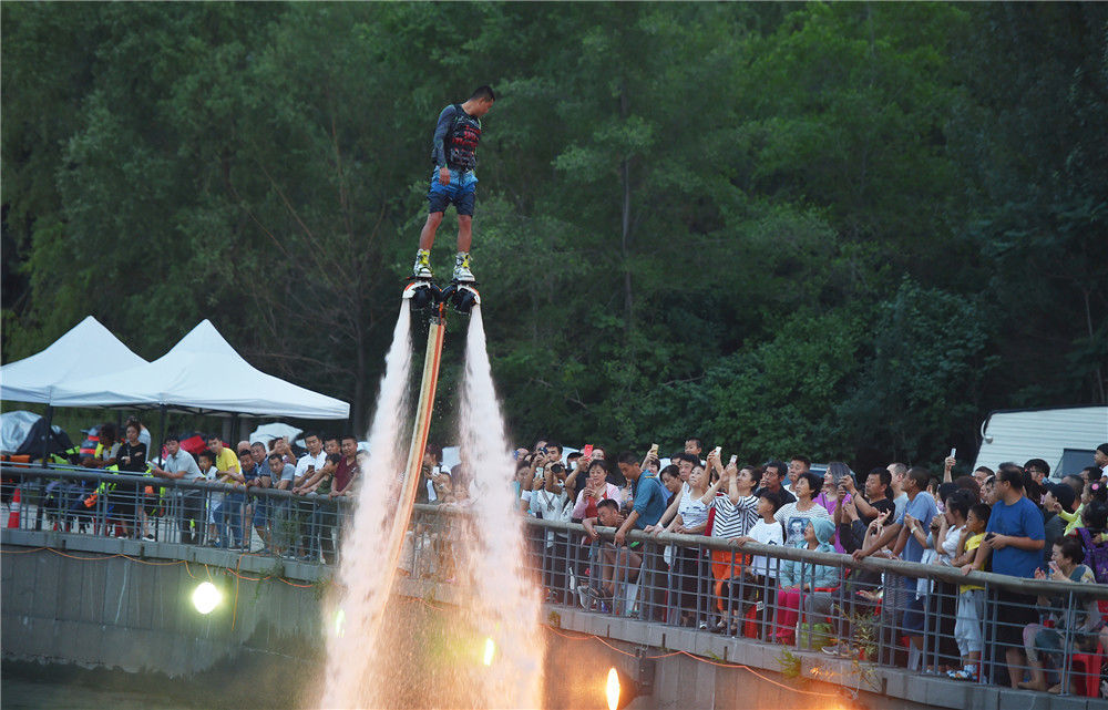 2018年7月7日,沈阳浑河上演水上飞人特技,吸引数百群众围观拍照。东滨/视觉中国
