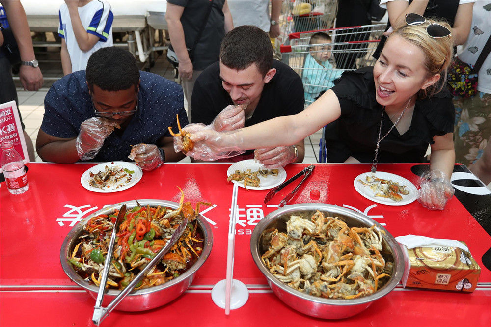 2018年7月7日,一场“六月黄”品蟹会在上海拉开帷幕,2000只来自阳澄湖的大闸蟹被厨师现场烹饪,吸引路人围观品尝。现场还有三位外国友人与上海大妈们展开一场吃蟹较量。张亨伟(上海分社)/中新社/视觉中国