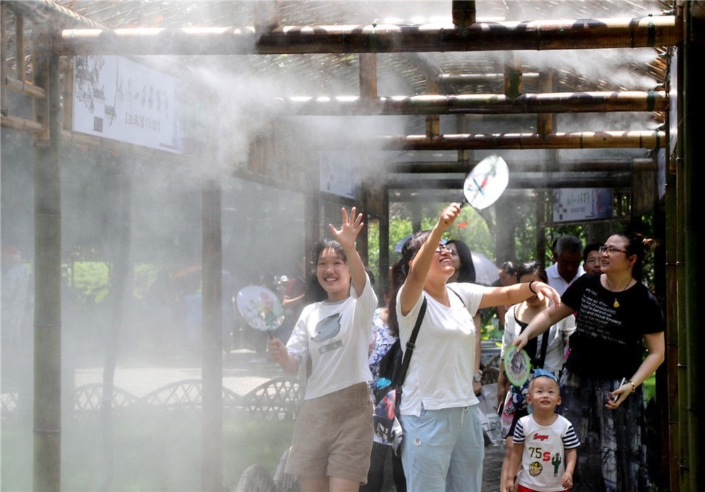 2017年07月07日,几名暑游客在苏州拙政园一处竹廊内享受喷雾带来的清凉。王建中/视觉中国