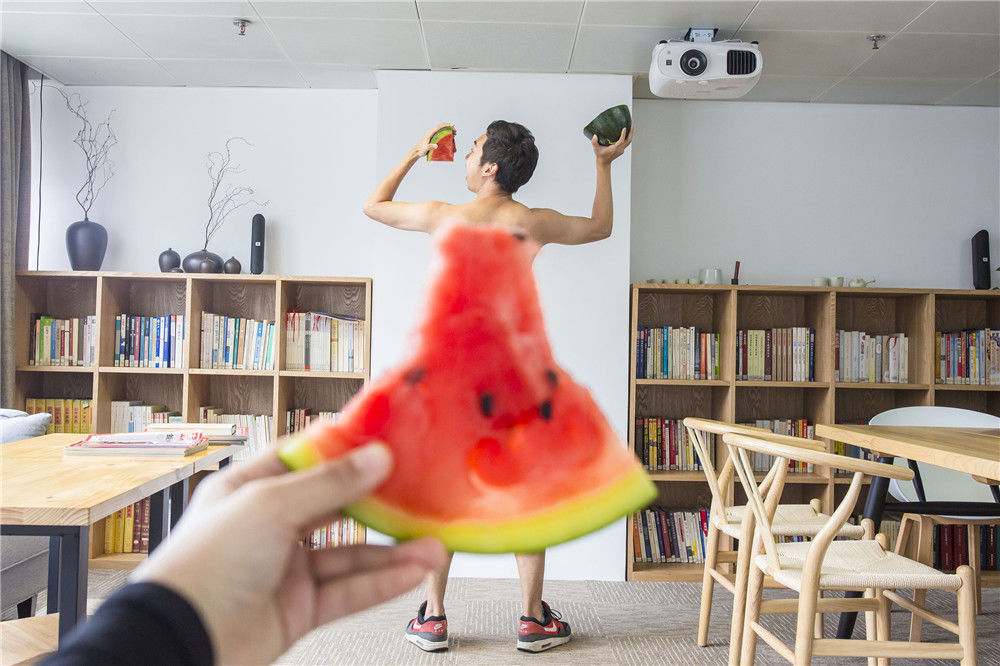 2017年7月7日,广州天河五山,热辣辣的小暑已然来临。在这“上蒸下煮”的热情季节里,记者把西瓜切成裙子的形状,利用巧妙的角度在广州街头拍摄了一组人们“身穿”西瓜裙的照片。陈忧子/视觉中国