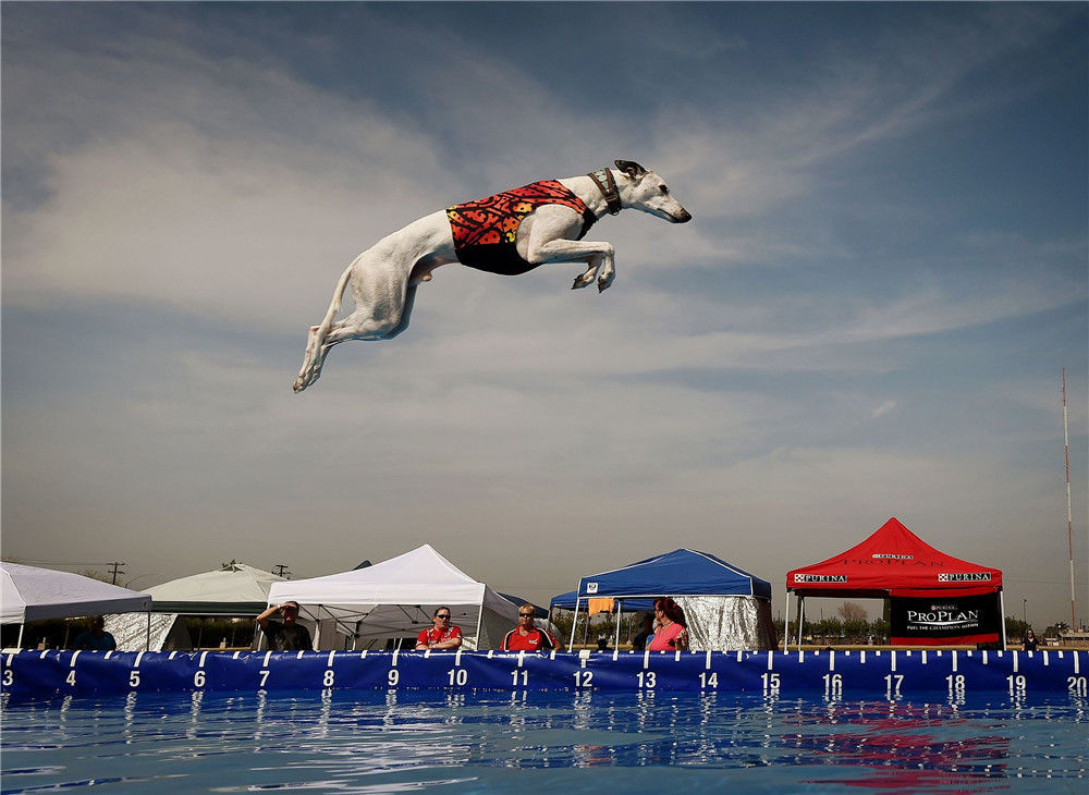 当地时间2016年2月26日,美国加州,贝克斯菲尔德举行宠物狗“跳远”大赛,宠物的主人记录动物们起跳后到入水前的距离。MARK RALSTON/视觉中国