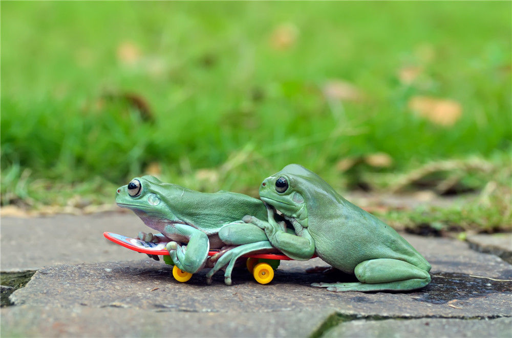 2016年8月16日讯(具体拍摄时间不详),印尼坦格朗,野生动物摄影师Thomas Chandra在印尼的街头捕捉到了两只长约5厘米的树蛙趴在袖珍滑板玩具上的有趣画面。Thomas Chandra/视觉中国