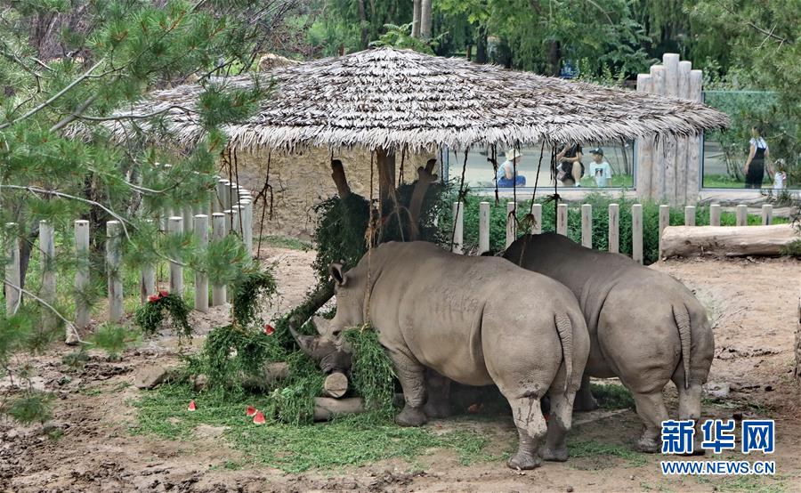 7月18日,在北京动物园,犀牛在防晒棚下吃草。新华社记者李欣摄