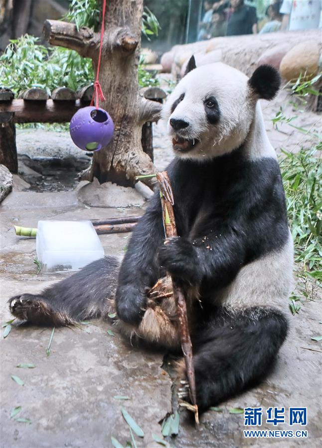 7月18日,在北京动物园,熊猫古古在空调屋内的冰块旁吃竹子。新华社记者李欣摄