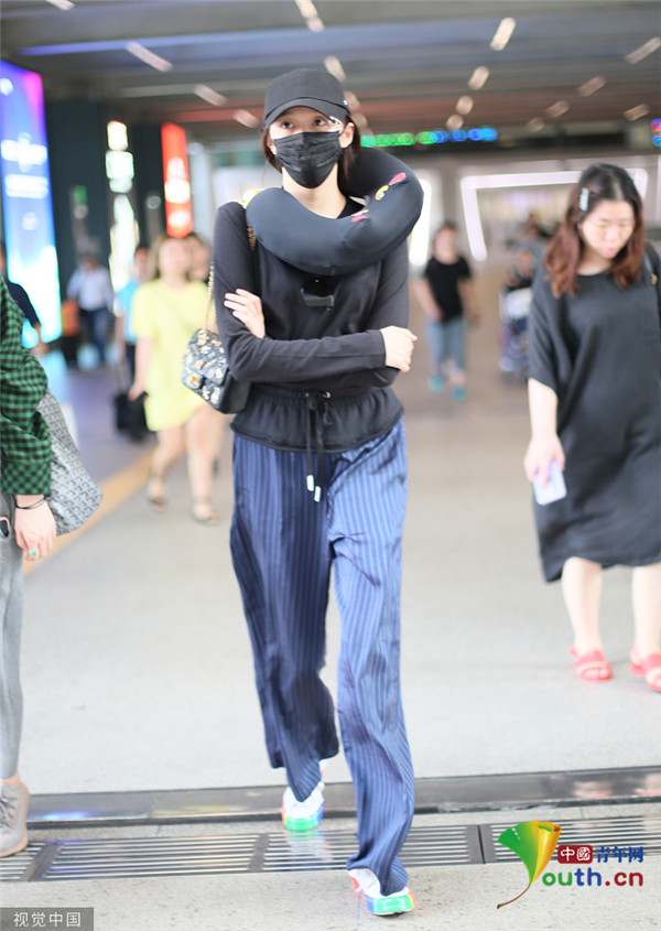 关晓彤淡定抱臂行走 脖子上挂U型枕毫无偶像包袱