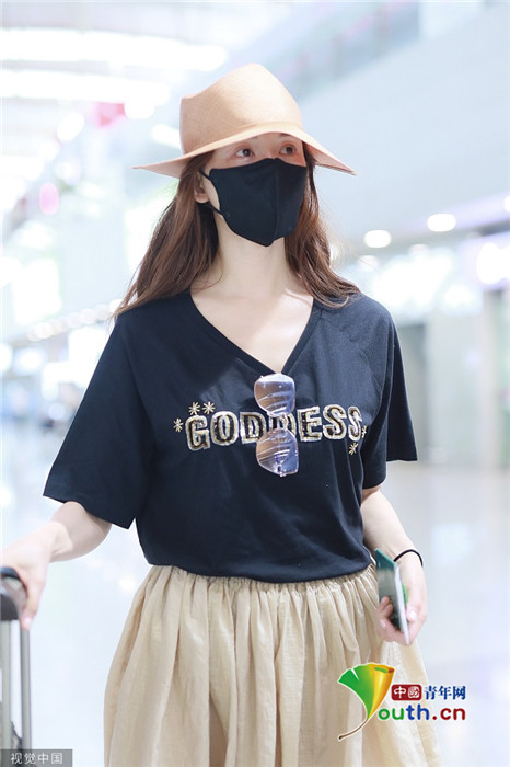 2019年7月23日,上海,林志玲现身机场,穿着打扮与三天前在台北机场相比毫无变化,依旧身穿黑体恤搭配米色休闲裤,墨镜也依旧挂在胸前。