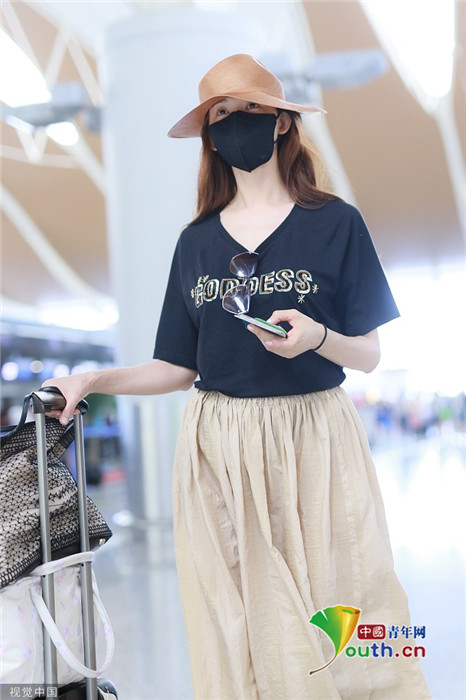 2019年7月23日,上海,林志玲现身机场,穿着打扮与三天前在台北机场相比毫无变化,依旧身穿黑体恤搭配米色休闲裤,墨镜也依旧挂在胸前。