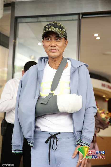 任达华出院 右臂绑绷带不忘竖拇指精神状态佳
