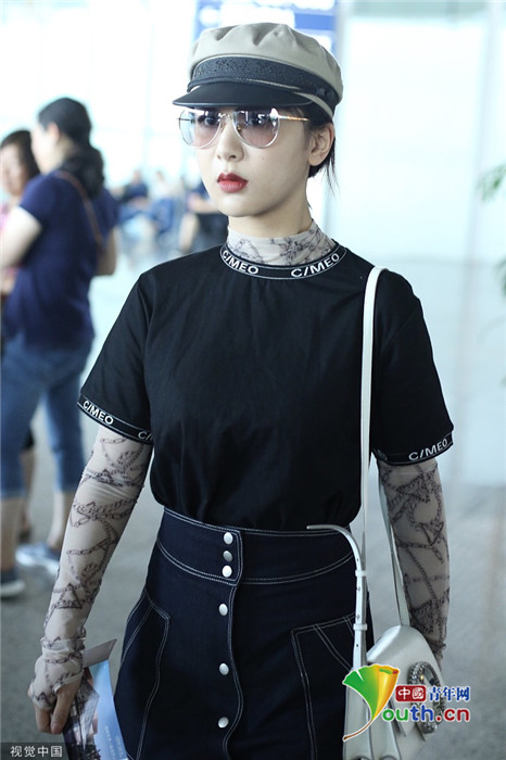 2019年7月25日,北京,杨紫现身机场。她穿黑色短T配牛仔裙变时髦女郎,戴报童帽架墨镜”港风女sir“即视感,人气爆棚。