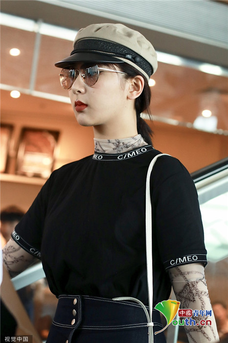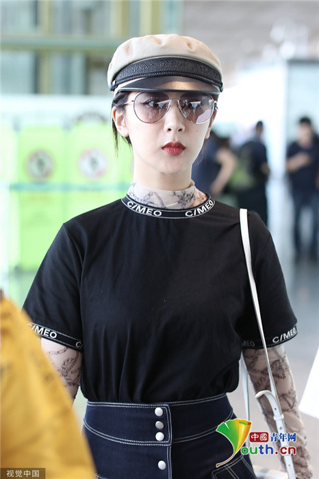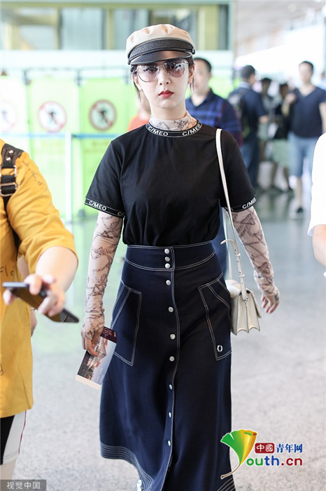 2019年7月25日,北京,杨紫现身机场。她穿黑色短T配牛仔裙变时髦女郎,戴报童帽架墨镜”港风女sir“即视感,人气爆棚。