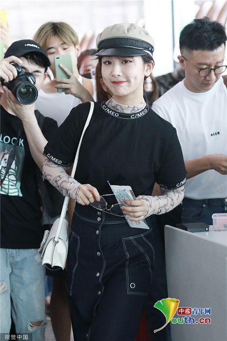2019年7月25日,北京,杨紫现身机场。她穿黑色短T配牛仔裙变时髦女郎,戴报童帽架墨镜”港风女sir“即视感,人气爆棚。